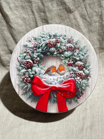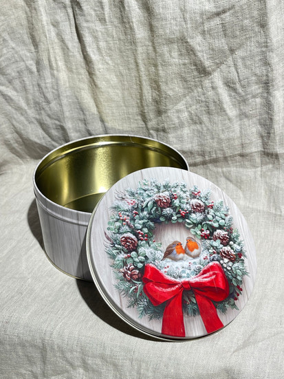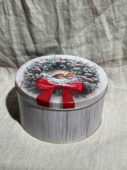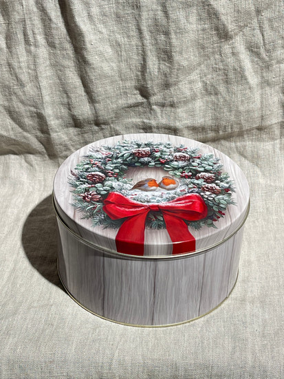 En sjarmerende kakeboks med motiv av julekrans og liten fugl, kombinert med en bunn i naturtro trestruktur. Det nostalgiske uttrykket gir boksen en varm og tradisjonsrik julestemning. Perfekt som en liten gave til noen du er glad i – eller som en hyggelig førjulsgave til deg selv.