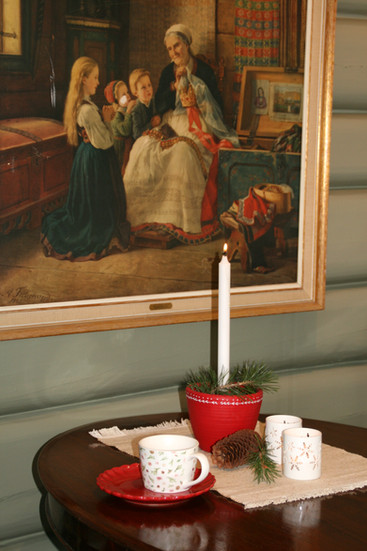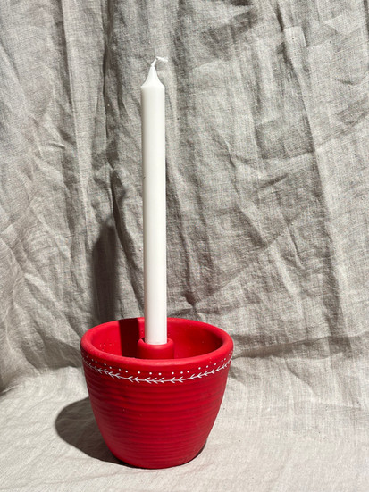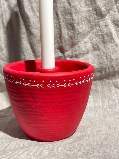 En nostalgisk og enkel lysholder i dyp rød keramikk, med en liten dekorativ bord øverst som gir et klassisk og koselig uttrykk. Den kan fylles med det du ønsker – kanskje litt granbar, små kongler, nøtter eller annen julepynt – for å gi et personlig og stemningsfullt preg.