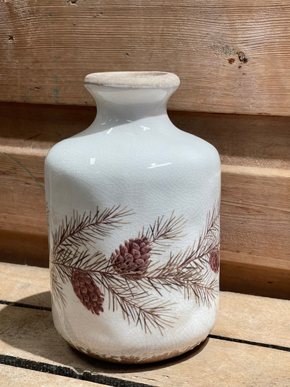 En enkel keramikkvase, pyntet med mønster av furukvister og kongler. Det er noe tidløst ved den – som å hente litt av naturens ro inn i stua. Mønsteret minner om kalde vintermorgener, duften av vedfyring og små turer i skogen. En vase som bærer med seg følelsen av det enkle, det ekte – og den gode, varme stemningen vi husker fra før i tida. H15,5 x L16 x B13
